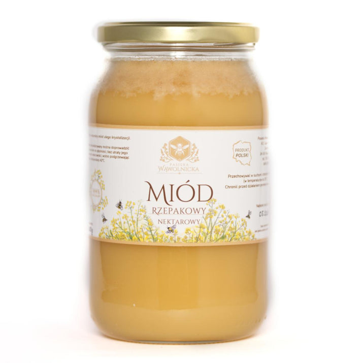 Miód rzepakowy (1200 g) — jasny, delikatny i kremowy w smaku; idealny dla dzieci i do słodzenia napojów.