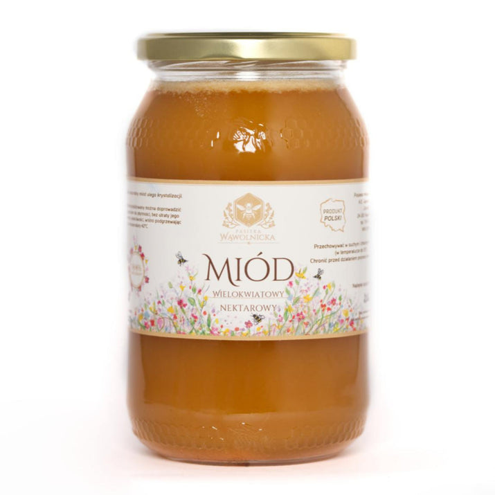 Miód wielokwiatowy (1200 g) — zrównoważony, aromatyczny, o bogatym bukiecie zapachów; świetny jako dodatek do pieczywa i deserów.